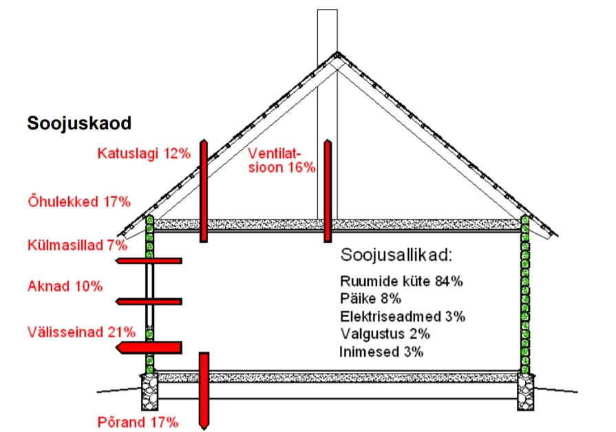 Küsin alati, kas on soov maja korrastada suvekoduks või aastaringseks elamiseks. Suvekodu puhul võib leppida vähemate mugavustega ja suuremate õhuleketega. Püsiva elukoha puhul tuleb esmalt kaardistada kohad, kus on sõna otseses mõttes augud hoones, nt vundamendis, mädaniku kahjustused palgis, vahelae augud läbijooksust või ebatihedad avatäited. Soojuskadude joonisel on esitatud, kuhu kaob soojus ideaalolukorras, kui hoone korras. Üks puitmaja ei ole soojapidavuselt kehv, kuid ajas on väsinud. Näiteks meie maja (köetavat pinda 164 m2) tänane neto energiavajadus on u 25-30 kW. Aastas kulub 20 m3 puid ja elektrit 11 500 kW/h ja rahaliselt oli see eelmisel aastal kogukulus 2500 €. Me ei küta toasoojaks kogu maja ja ikka on pooles kasutuses olevas osas külm, kui miinuskraade on üle 15 kraadi. Pärast renoveerimist peaks energiavajadus ja kulu küttele olema poole väiksem.