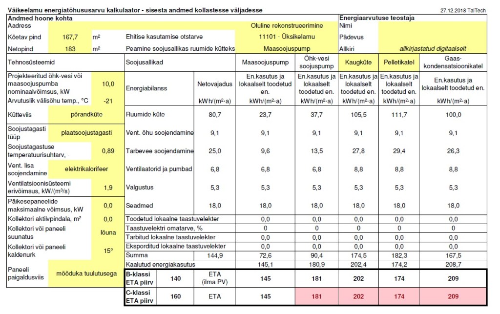 Tulemuste tabelis on näha, kui palju kulub hoone küttele, ventilatsioonile, tarbeveele, valgustusele ja seadmetele. Sellest järeldub, et küttele kulub pool energiast. Oluline on muidugi ventilatsiooni olemasolu. Selleta on C-energiaklassi saavutada võimatu. Määrused on sedasi koostatud, et ei saaks C-energiaklassi ilma ventilatsioonita. Ilma väliseinte liigse soojustamiseta jääb valikusse ainult maasoojuspump. Tabelis on näha pelletikatla arvutus, aga ahjuküttega on numbrid üle 200. Pelletikatlaga jõuaks C-klassi ilmselt siis, kui tarbevee soojendamine ühendada katlaga. Lihtsustatud meetod arvestab, et soojendatakse elektriga. Üllatav on tegelikult ventilatsiooni tarbimine, mis on kaks korda suurem kui valgustus, aga sisuliselt kogu aeg üks asi töötab. Ventilatsioonile kulub kaks korda vähem energiat kui meie igapäeva koduelektroonikale. Teistpidi arvutades jõudsin järeldusele, et tasub investeerida ventilatsiooni, kuna selle täiendav kulu on väiksem kui Kredexi pakutav toetus ilma ventilatsioonita. Mõõtes magamistoas C02 taset, süvenes üha rohkem veendumus, et on vaja ventilatsiooni.