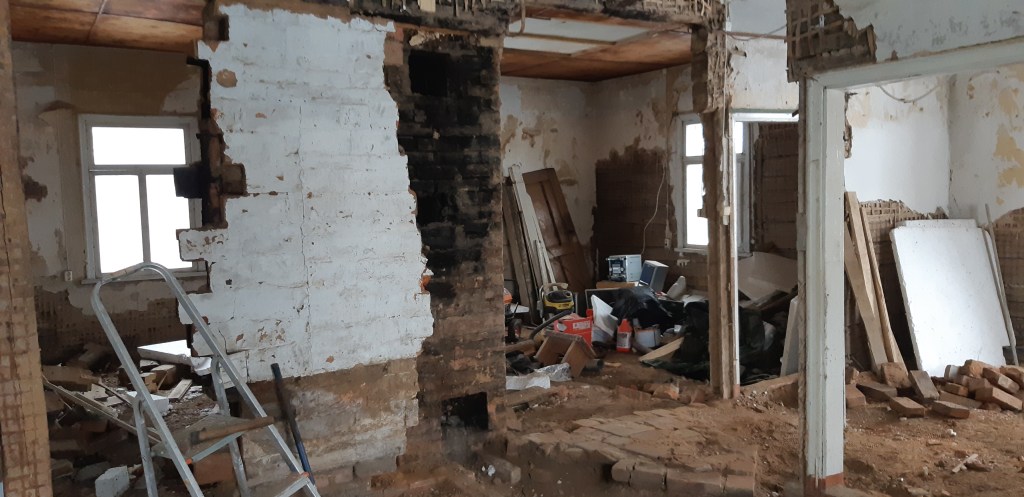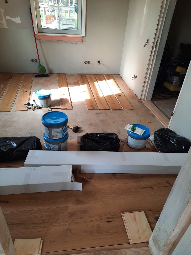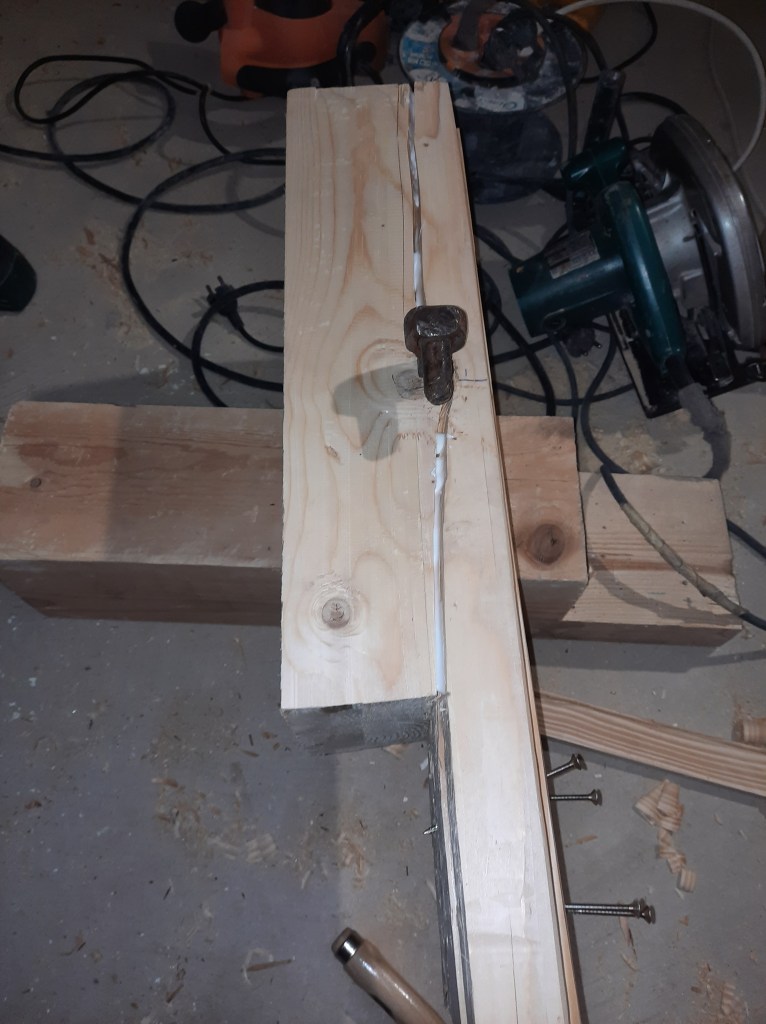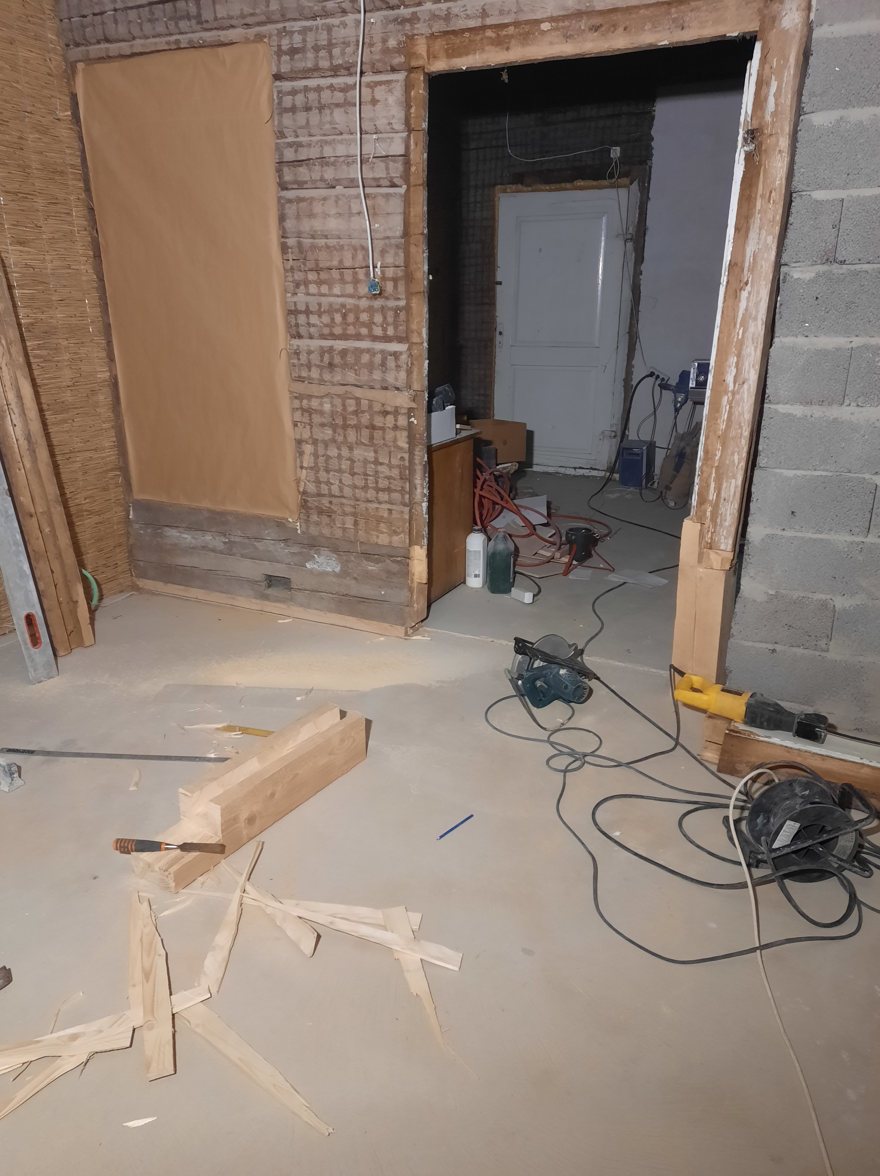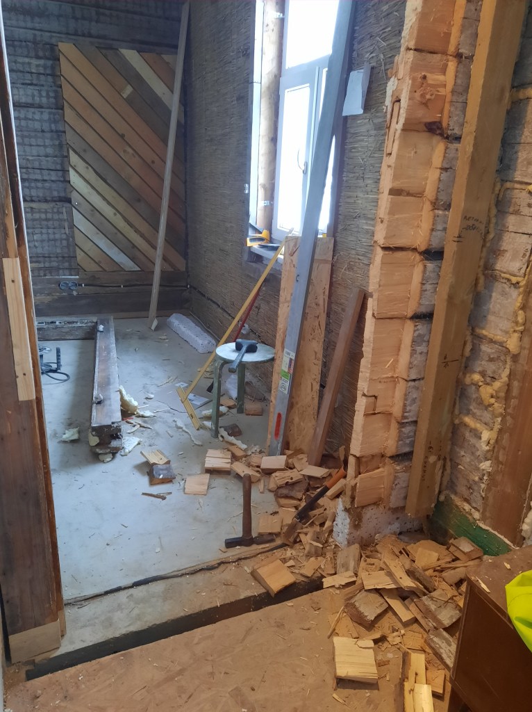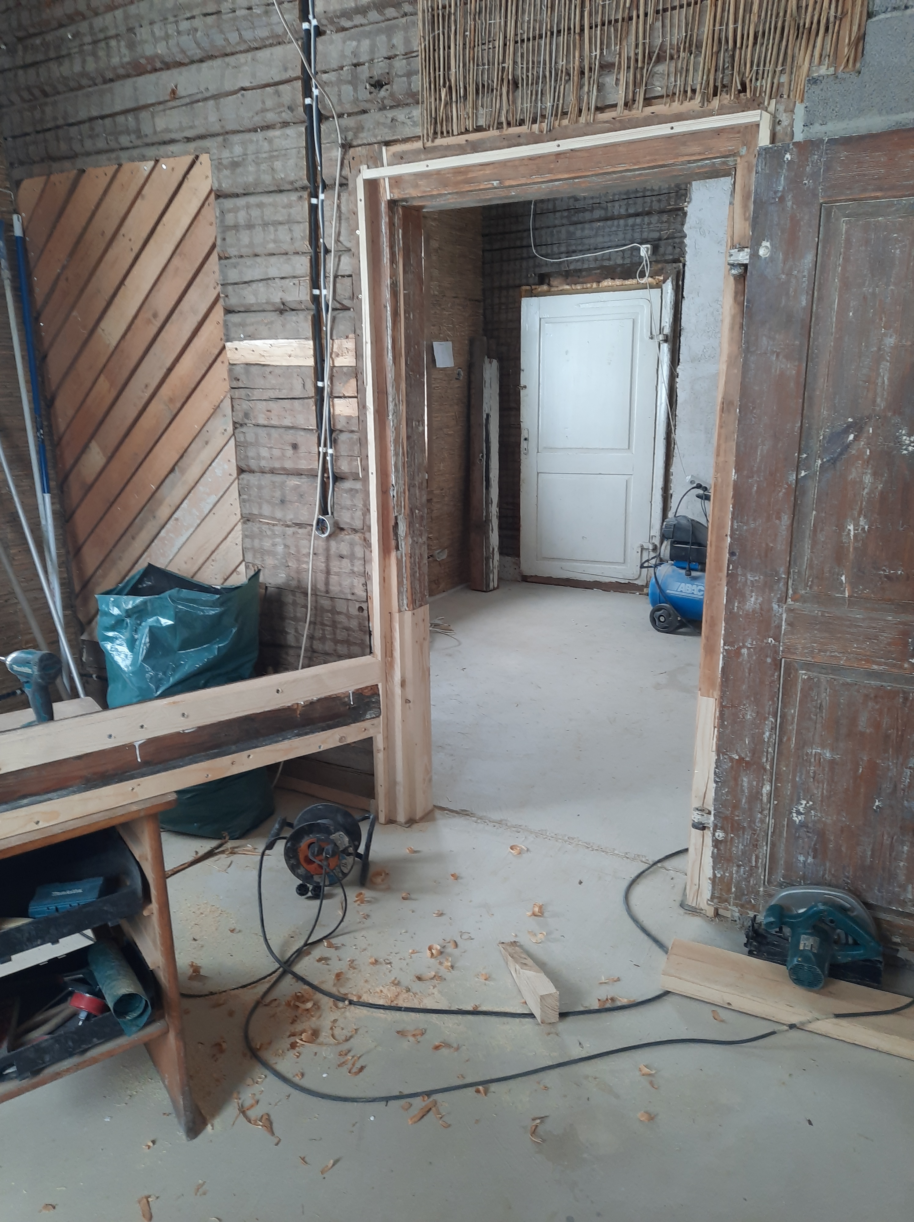 Magamistoa uks, mis avanes esikusse tuli ümber pöörata ning nihutada välisseina poole. Vannitoa planeerimisel nihkus ukseava 150 mm välisseina poole. Selleks oli vaja lõigata uued keeled olemasolevasse palki. Uks avanes varem magamistoa poolele aga sedasi varjas see osaliselt loomuliku valgust. Kuna üks välisuks kaob tulevikus, siis keerasin ka selle ukse teist pidi, avanemisega esikusse. Lengi pinnal oli ohrtalt putuka- ja mädanikukahjustusti. Õnneks oli rahuldavas seisukorras see puitosa, kus asusid hinged ja sedasi võis pool lengi ära lõigata, liimida proteesi asemele ja kõik ühte tasapinda hööveldada. Puidupahtel tegi viimase ime.